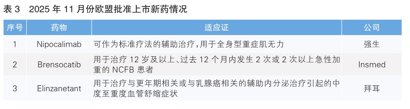 2025年11月份,欧盟批准3款新药上市。根据Pharmadigger数据库,均非全球首次获批(详见表3)。